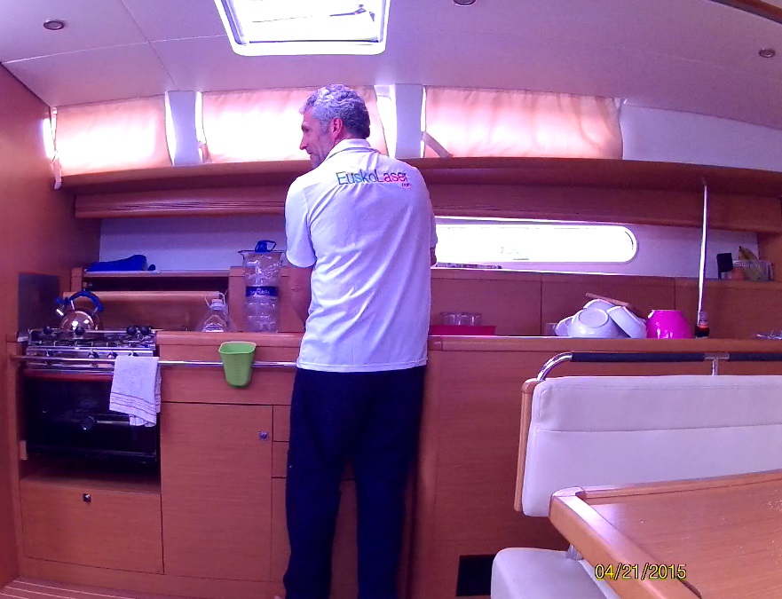 Una gozada poder aprender de mano de 3 buenos amigos todos ellos capitanes con muchos muchos años de navegación, el manejo de las cartas, la electrónica de a bordo (piloto automático, AIS, Radar). En un ambiente distendido organizamos los turnos de guardia (cada 2 horas). Afortunadamente el viento es constante, fijado el rumbo en el piloto automático alrededor de 325º; Navegamos de ceñida con bastante escora.
